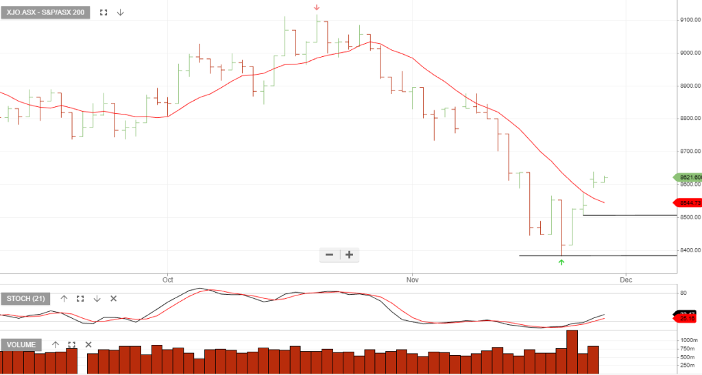 The XJO is above the 10-day average and is building support above the 8506 level.