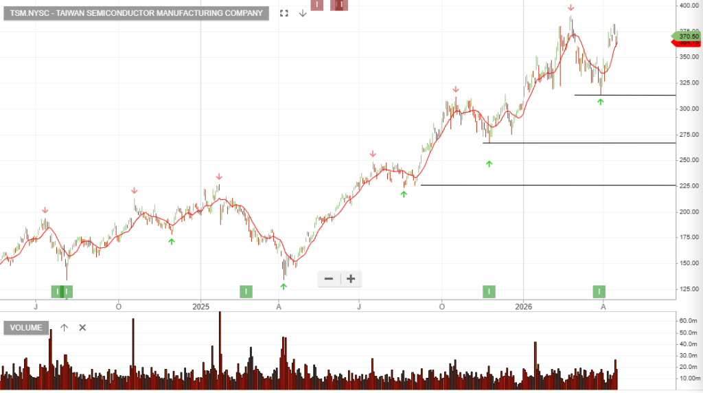 TSMC (TSM) recently reported exceptionally strong Q1 2026 results on April 16, 2026, leading to a revised upward outlook for the remainder of the year. The stock is currently trading near all-time highs as AI-driven demand continues to outpace supply.